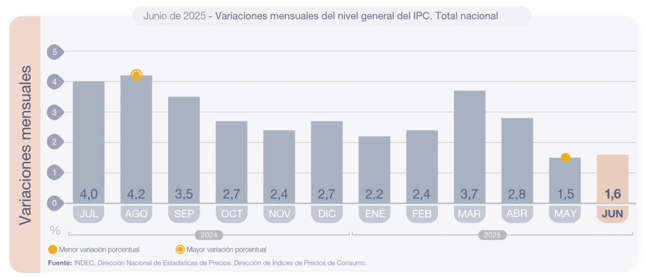 El Índice de Precios al Consumidor (IPC) registró en junio de 2025 una suba del 1,6%, según el informe mensual publicado por el INDEC. Se trata de la variación mensual más baja desde enero. Con este dato, la inflación acumulada en lo que va del año alcanza el 15,1%, mientras que la variación interanual se ubica en el 39,4%.
