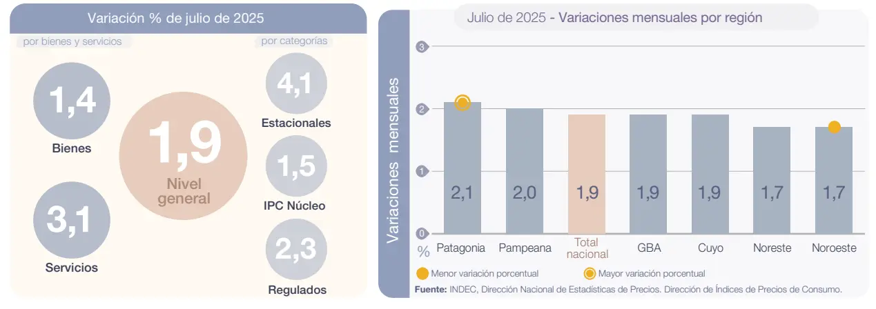 El informe oficial muestra diferencias entre regiones. En la Patagonia, el rubro de mayor incidencia en el IPC de julio fue Transporte, con una variación del 4,6% mensual, por encima del promedio nacional. En el resto del país, la mayor contribución al alza provino de alimentos y bebidas.