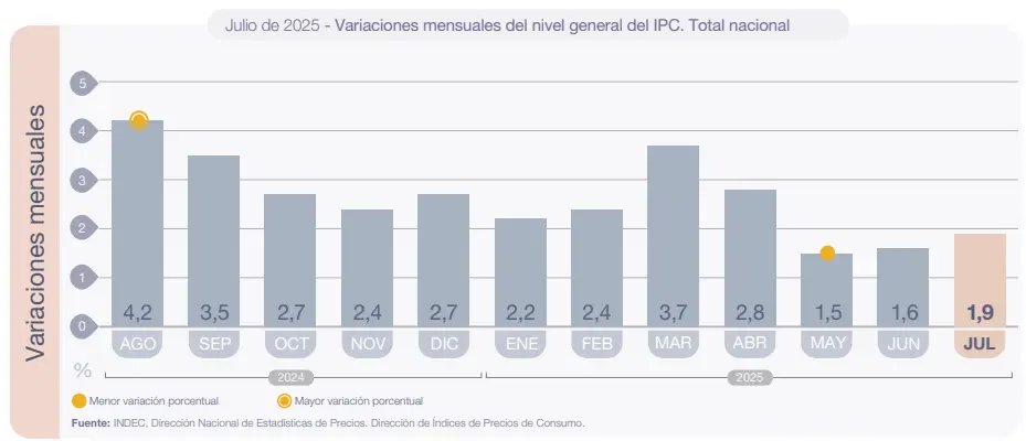 El Instituto Nacional de Estadística y Censos (INDEC) informó que la inflación de julio de 2025 registró un aumento del 1,9% respecto de junio, acumulando un 17,3% en los primeros siete meses del año y un 36,6% en la comparación interanual. El dato implica una leve aceleración frente al 1,6% del mes anterior, aunque se mantiene por debajo del 2% por tercer mes consecutivo.