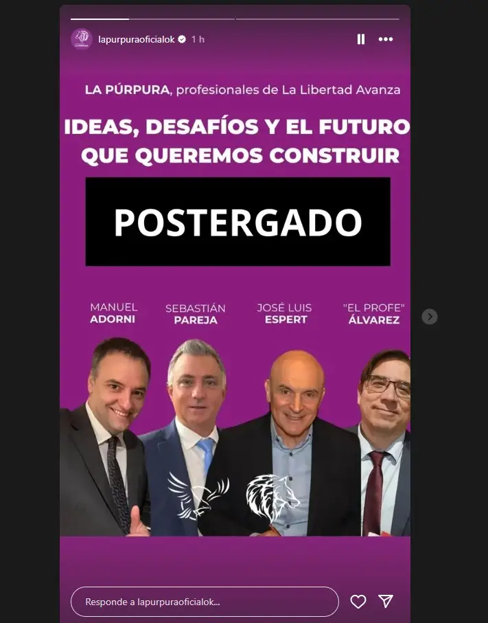 La decisión de "postergar" el evento fue confirmada por La Púrpura, un grupo que aglutina "profesionales" que simpatizan con el partido de Javier Milei y que lo había anunciado días atrás. El encuentro se llamaba "Ideas, desafíos y el futuro que queremos construir" y se iba a llevar a cabo a las 18 en el Teatro Bar de La Plata.